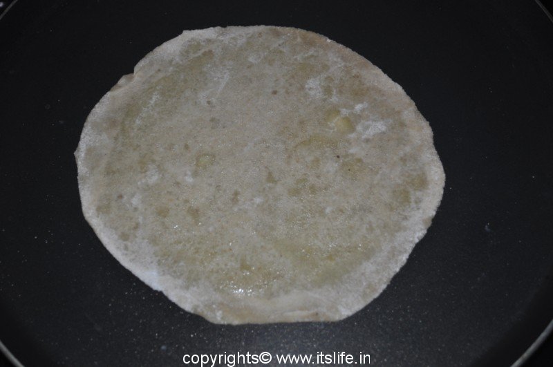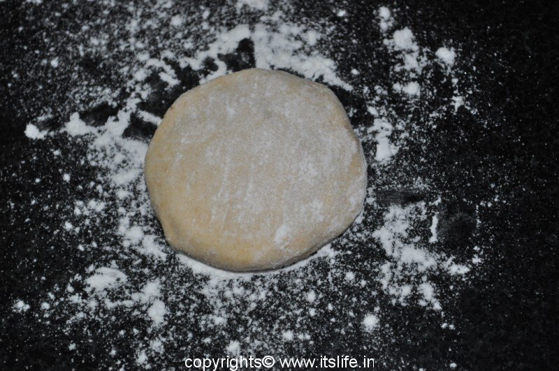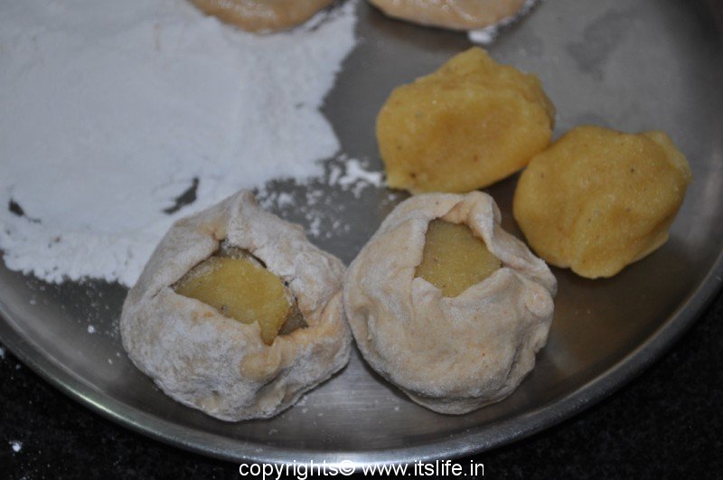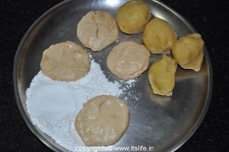 Flatten the Wheat flour ball and keep the Semolina ball over it. Close it.