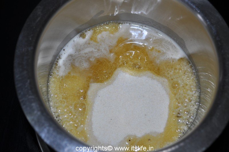 When it comes to a boil, add Rawa and mix well. Let it cook for a minute. Keep stirring. Add Cardamom powder and mix well. Remove and let it cool. Make into equal sized balls and keep aside.