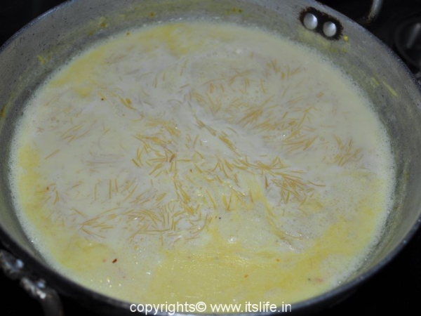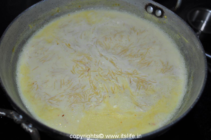 Heat Ghee in a thick-bottomed pan and fry the Shavige in it for a minute. Add Milk and let it boil for sometime.