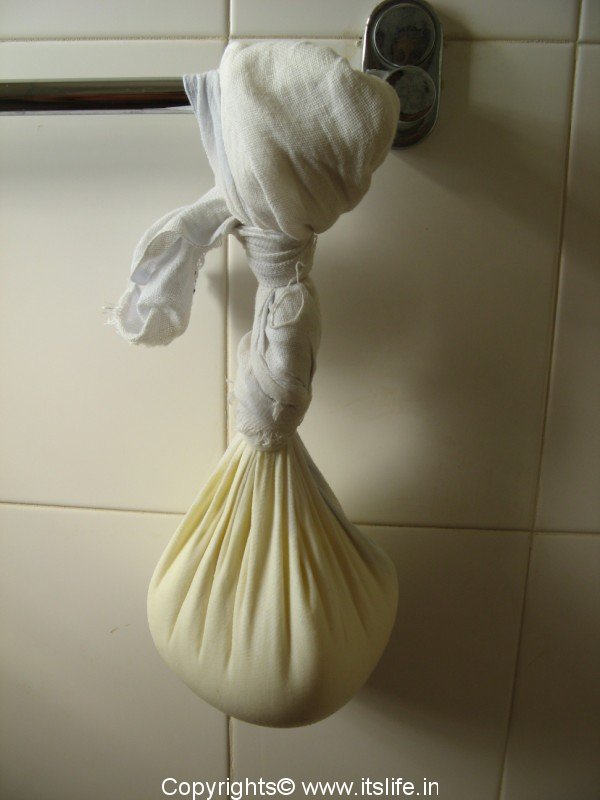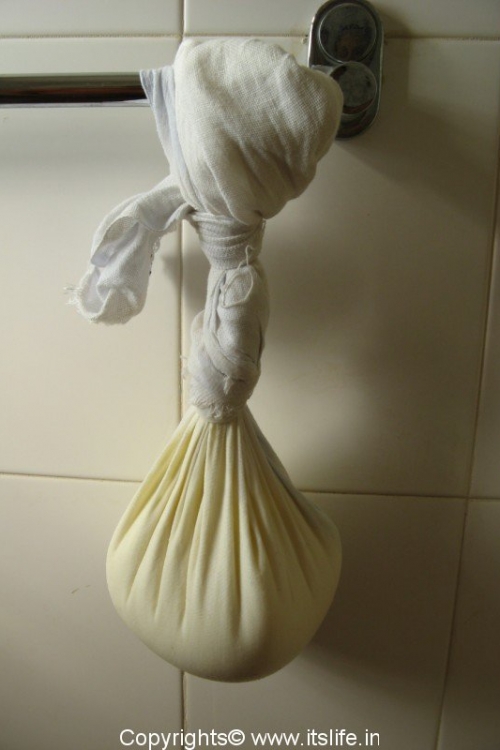 Tie curds in a cotton cloth and hang it for 4 to 5 hours in a suitable place for making curd cheese.
