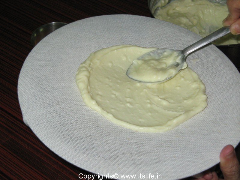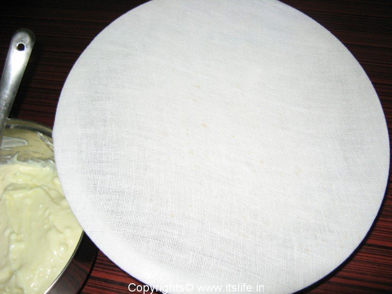 To a vessel tie a thin cotton cloth. Put the Curd-Sugar mixture over it and rub it over the cloth.