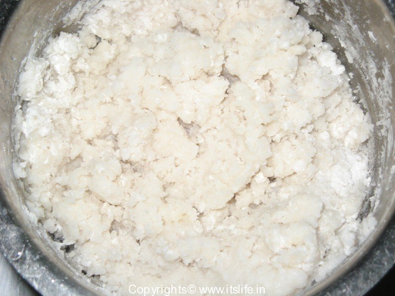 Lower the heat and add the Rice flour and Maida, little by little and keep stirring to form a dough.
