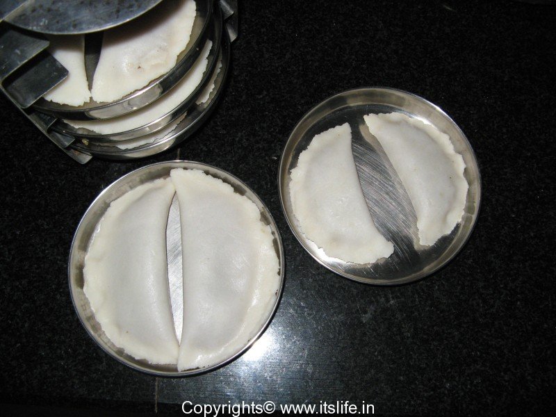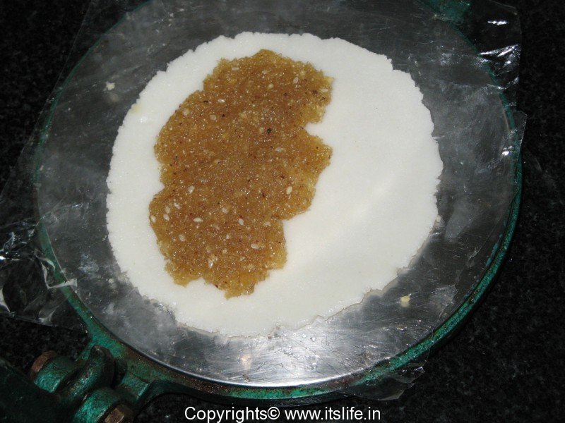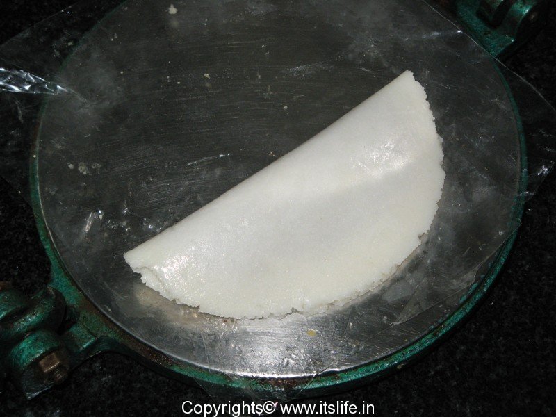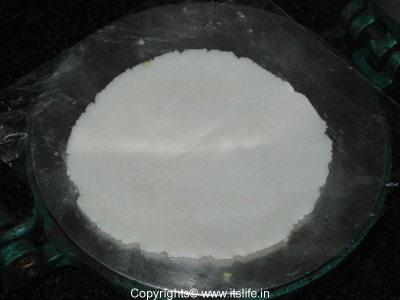 Flatten the Rice flour balls on the greased palm or on a greased surface into a circle.