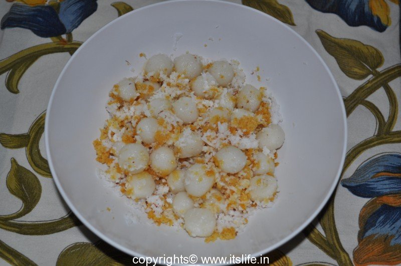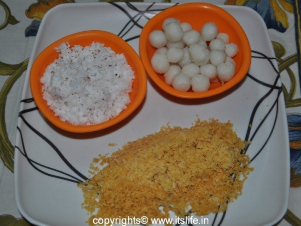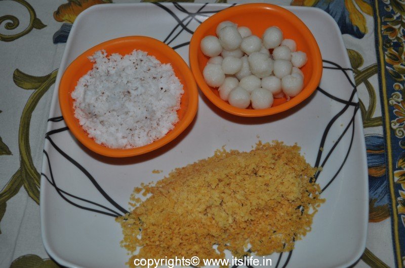 In a bowl mix the steamed rice balls, Jaggery, and Coconut.