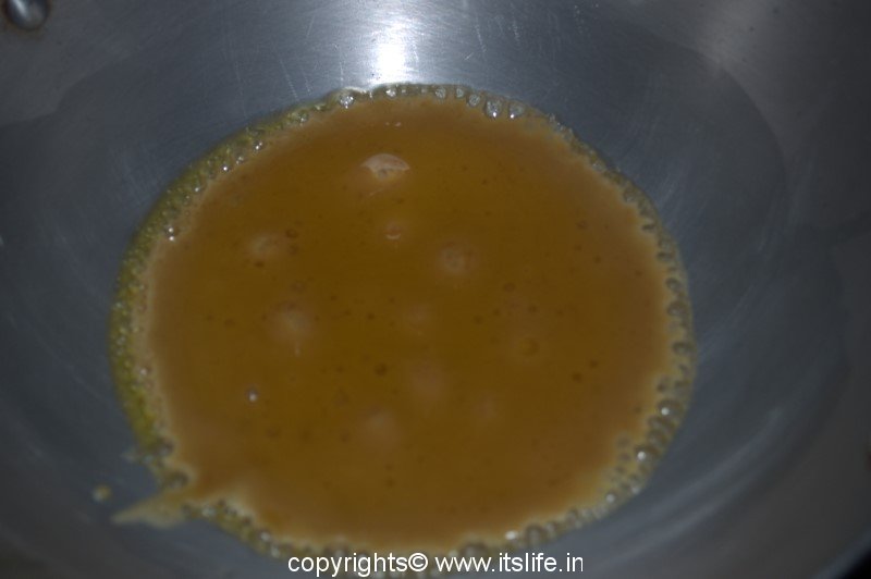 Let the jaggery melt. Cook until bubbles start appearing at the edges.