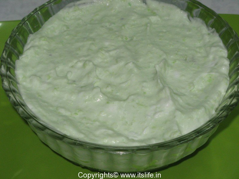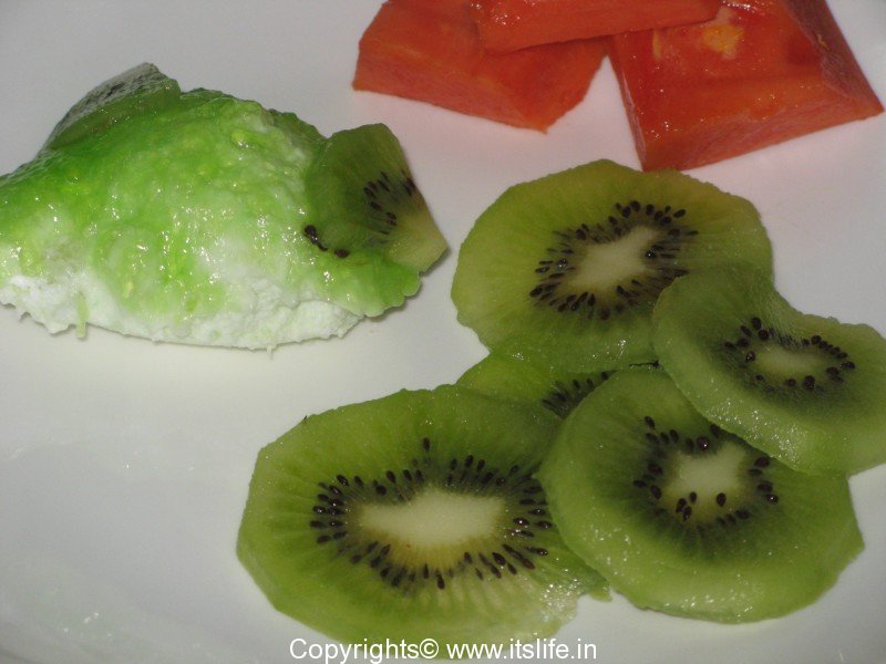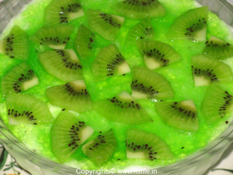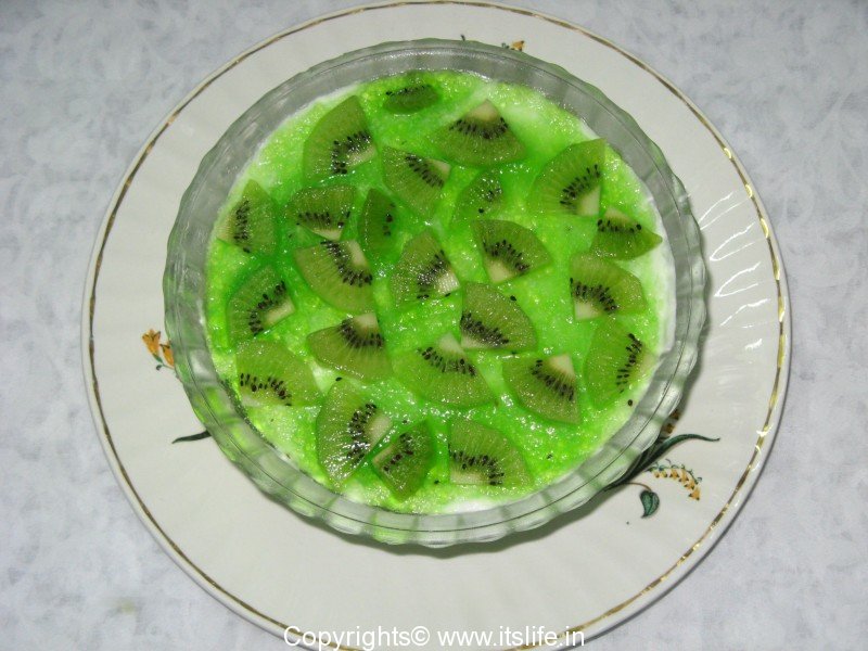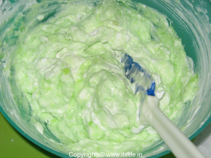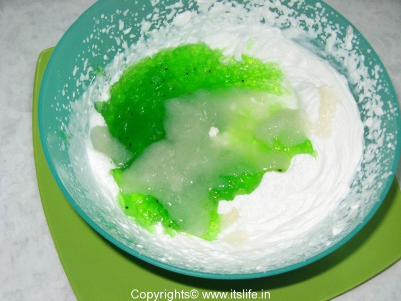 Add Kiwi crush, warm Agar Agar to the whipped Cream and fold it.
