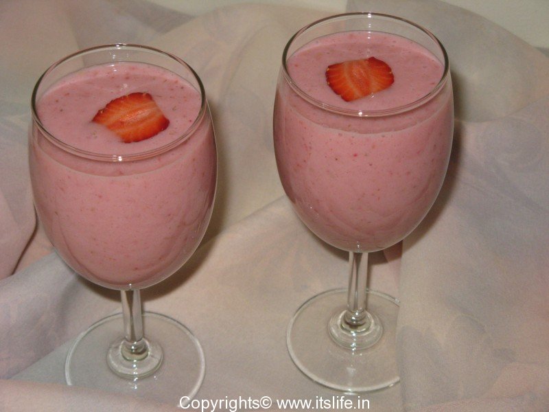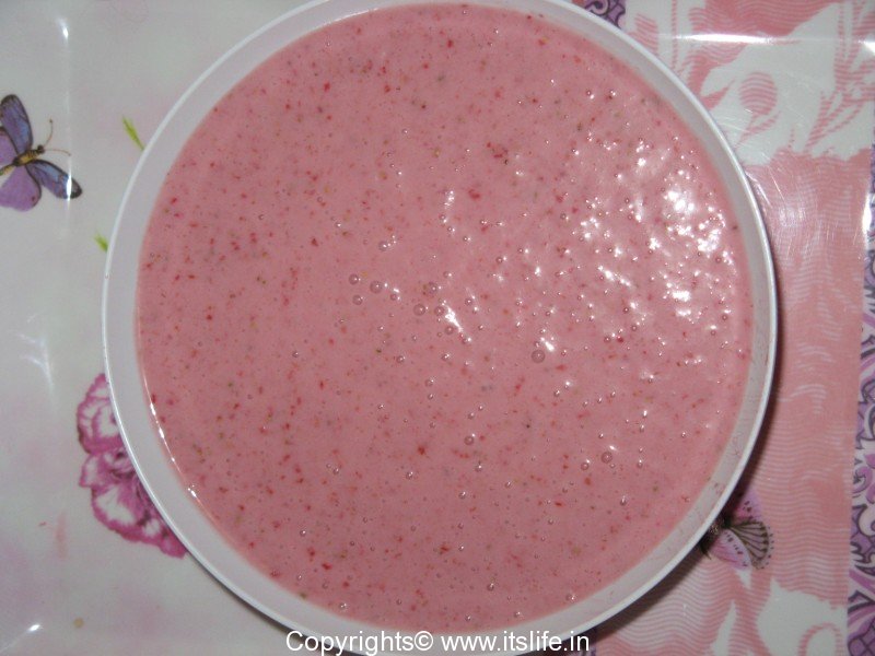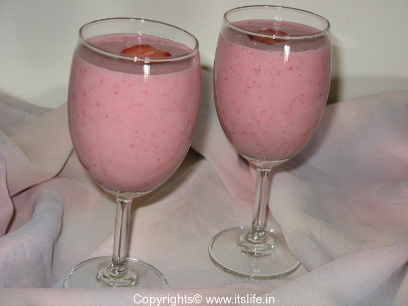 Strawberries are crushed along with Yoghurt and Milk to get a refreshing and healthy drink.