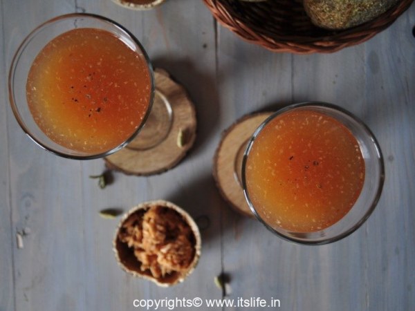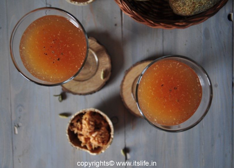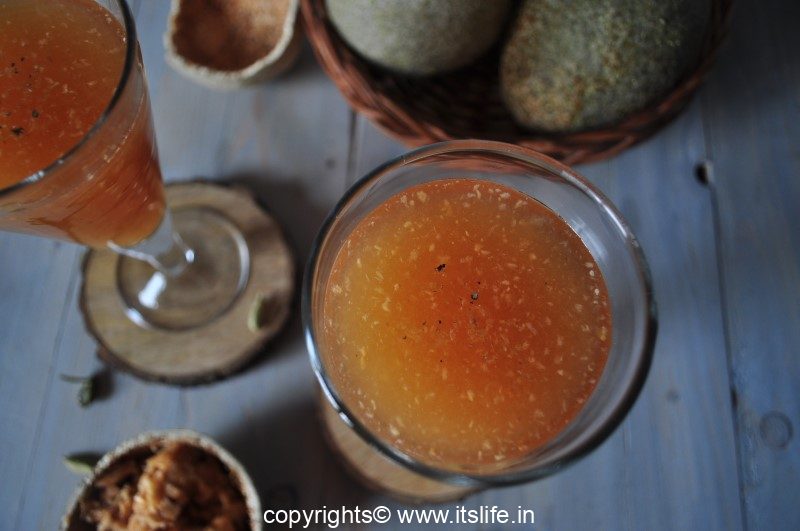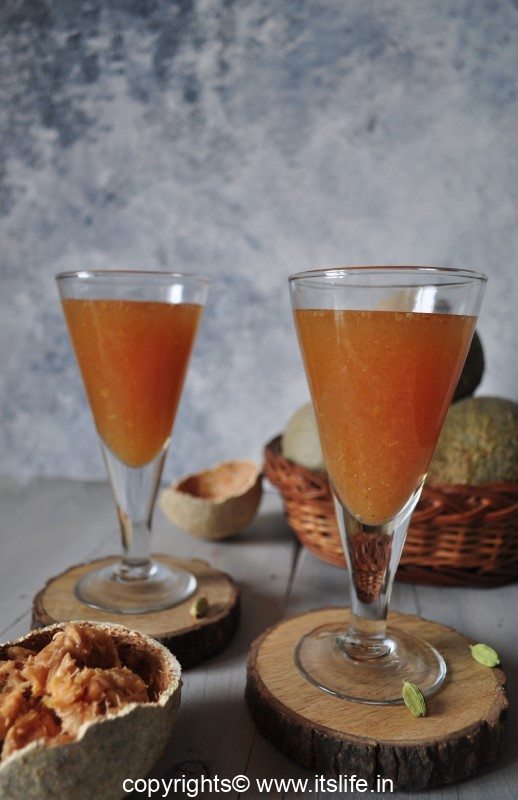 Remove the pulp in a vessel and add 2 cups of water and squish the fruit in the water using hands. Sieve and keep it aside. Add 1 cup water to Jaggery and melt it. Sieve Jaggery water and add to the fruit pulp. Add Cardamom powder and Salt and mix well. Chill the juice for an hour.