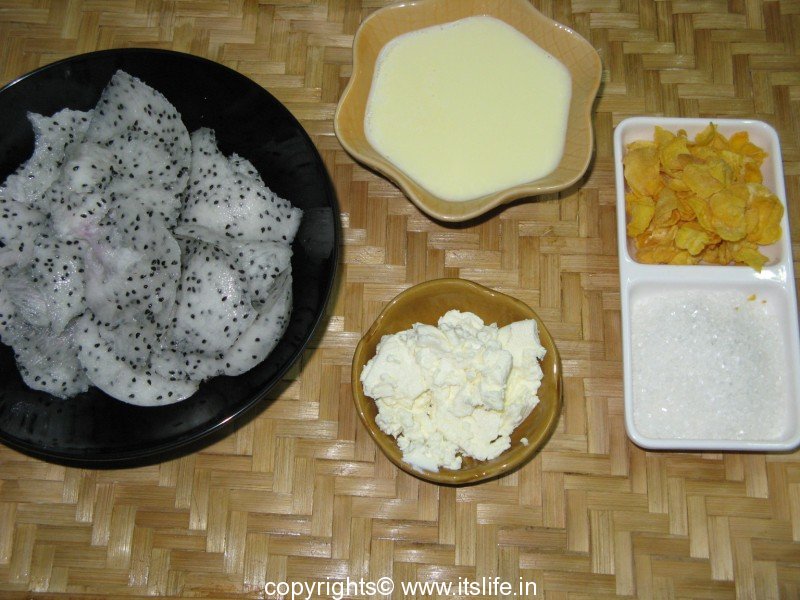 Serve Dragon Fruit Banana Smoothie topped with cornflakes or sliced sugar coated almonds.