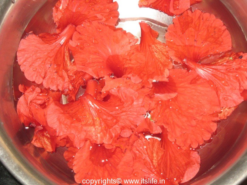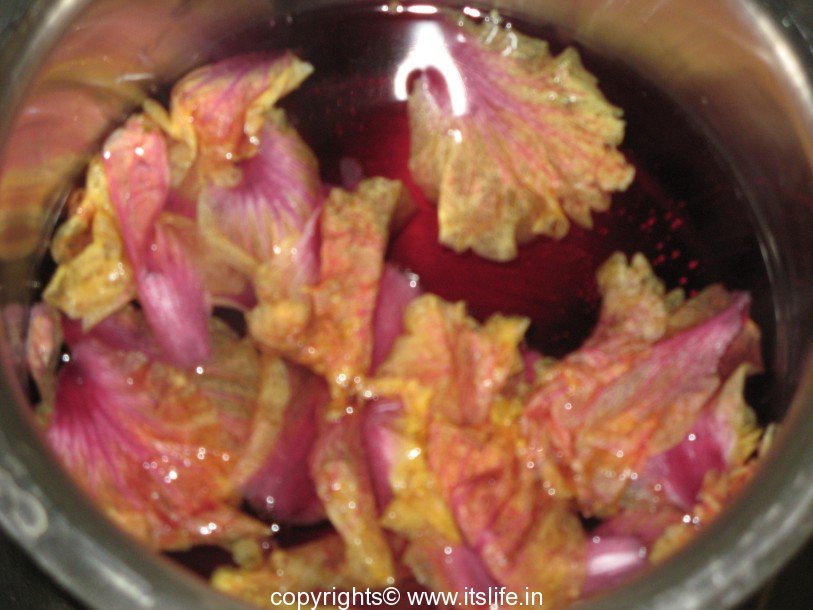 Boil two glasses of water and switch off the heat. Add the petals in the boiling water.