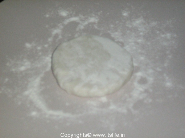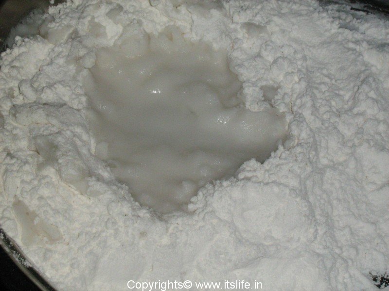 Take Rice flour and Maida in a mixing plate and pour little hot water on it and mix the flour. Keep adding the required quantity of water and mix to a dough and keep it aside covered with a wet cloth.