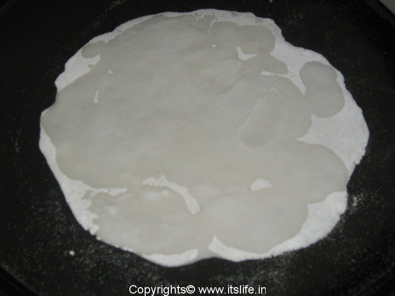Heat a griddle and put the rolled out Rice Rotti/bread over it and wet the side facing up using a damp cloth.
