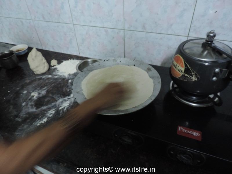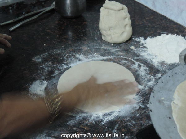 Mix flour with water and knead thoroughly to make a dough. If required more water can be added. Divide the dough into 8 balls. Flatten the dough into a circular shape on a floured surface using palms.