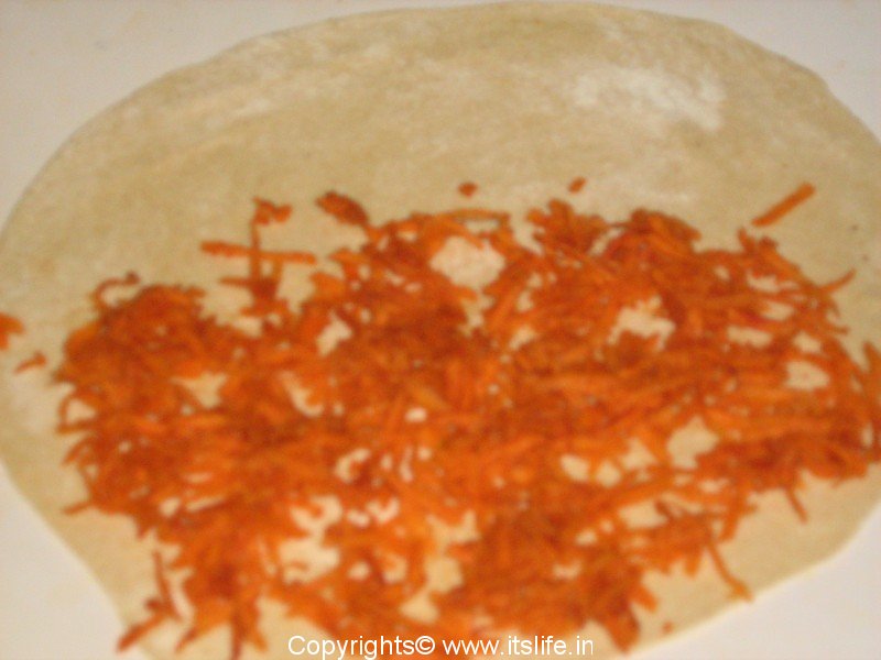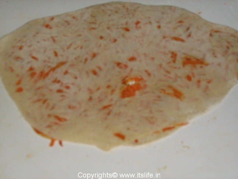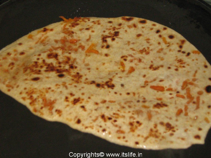 Mix Carrot, Hing, Black Salt, Chili Powder, Jeera Powder and Salt and keep it aside. Mix Wheat flour with water and Salt to a dough. Divide into balls. Roll out each ball on a floured surface to a concentric circle. Spread a spoonful of Carrot mixture on one half of the circle.