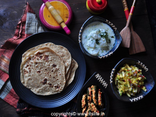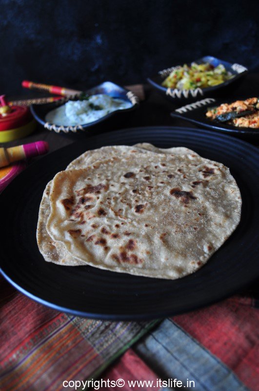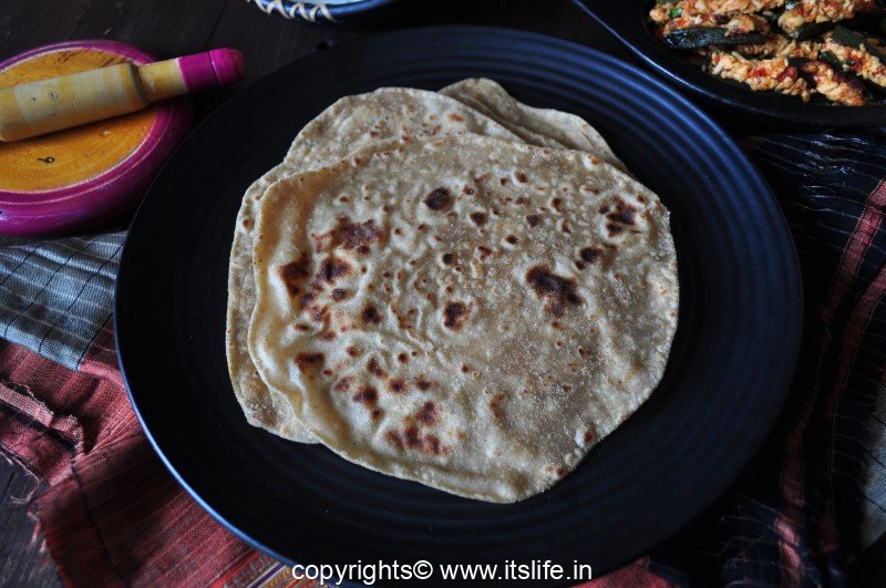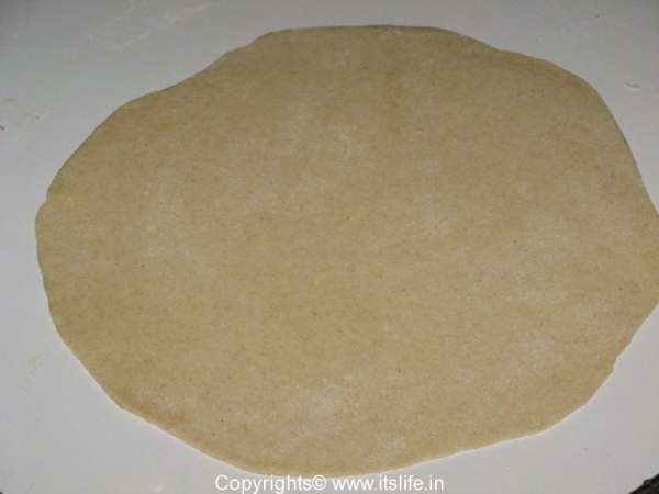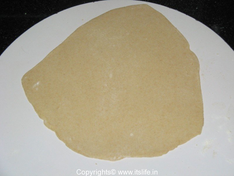 Put this on a heated griddle and put little oil all around the chapathi. Turn it quickly and roast for 20 seconds and turn again and roast for 10 seconds.