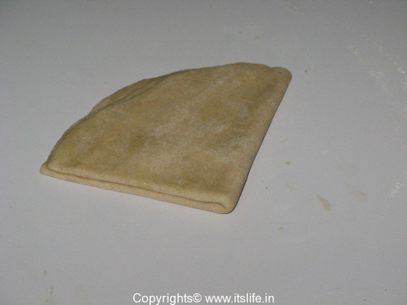Smear little oil over it and fold it into half. Apply oil again and fold it in half again. It will form a triangle shape.