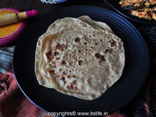 Put this on a heated griddle and put little oil all around the chapathi. Turn it quickly and roast for 20 seconds and turn again and roast for 10 seconds.