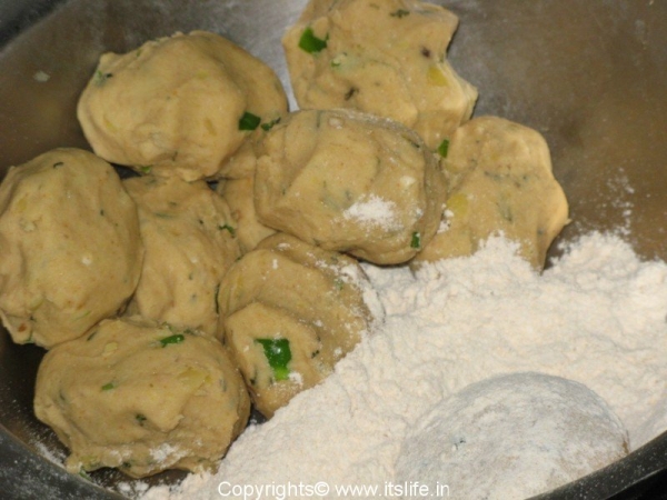 Mix all the ingredients together. If required add water and bind to a dough. Divide into balls. Roll each ball on a floured surface into a concentric circle.