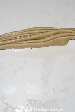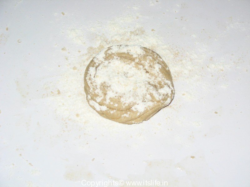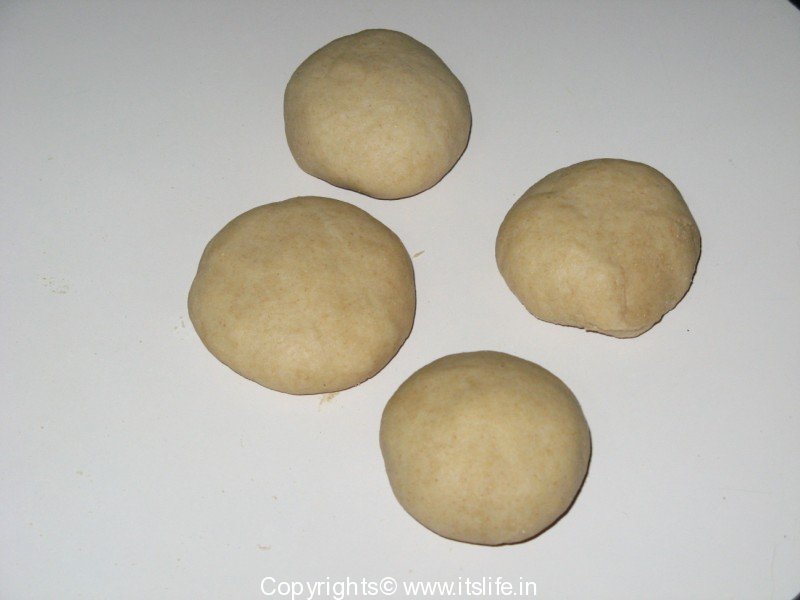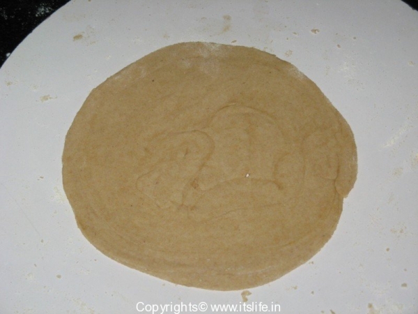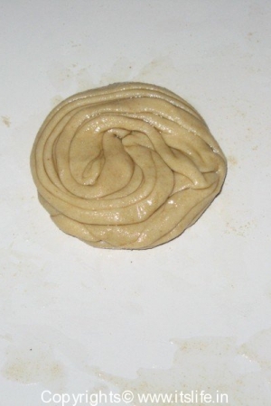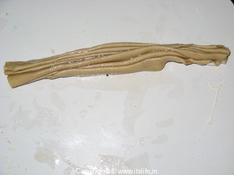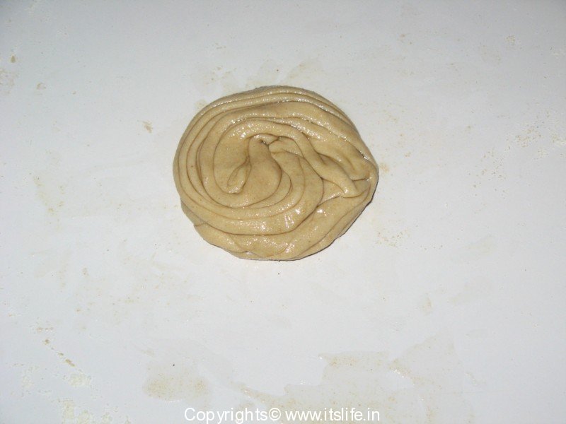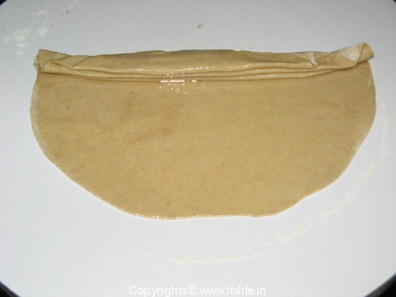 Mix Whole Wheat Flour, Salt and water and knead to a soft dough. Keep aside for 10 Minutes. Divide the dough into balls. Roll a ball on a floured surface to a concentric circle. Apply Ghee and pleat the flattened dough as shown in figure below.