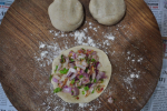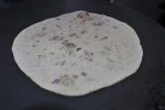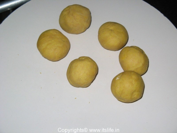 Mix the flours with water and knead to a dough. Divide the dough into balls.