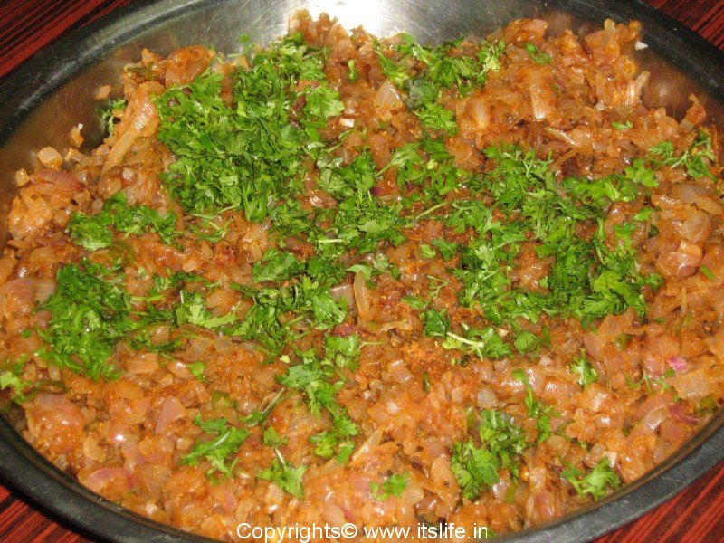 Chop Onions finely. Heat 1tsp Oil and add the Onions and saute until the water evaporates. Add Gram Flour, Green Chili, Saunf, Red Chili Powder, Sugar, Amchur Powder, Jeera Powder and Coriander powder and saute for a minute. Add Salt, mix and leave it aside to cool. Once the mixture cools down add Coriander leaves and mix again.