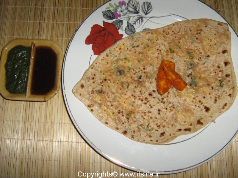 Mix Wheat flour with water to a dough and divide into balls.  Mix Paneer, Green Chilies, Coriander leaves, Salt and Jeera.