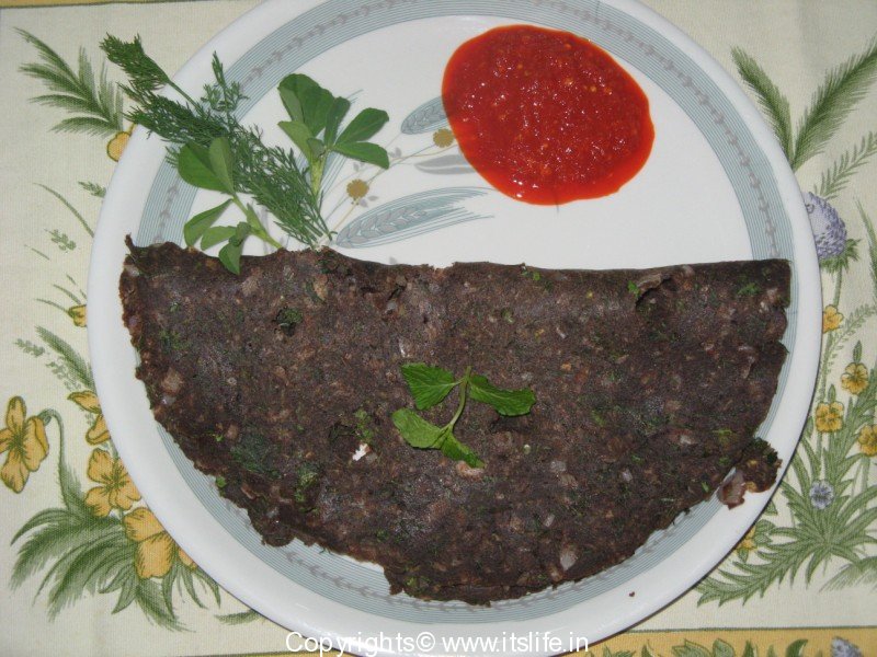 Healthy and nutritious bread prepared using Finger Millet flour and assorted leafy vegetables. This is a dish from Karnataka.