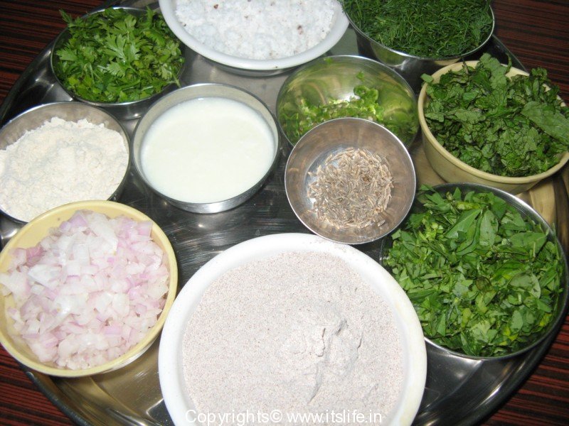 Wash and chop the Green leafy vegetable. Heat 2tbsp Oil and mix it with Ragi Flour, Rice Flour, Curds, Coconut, Green Chilies, Leafy vegetables, Onions, Jeera, Salt and required amount of water to a soft dough. Divide it into a tennis ball size balls.