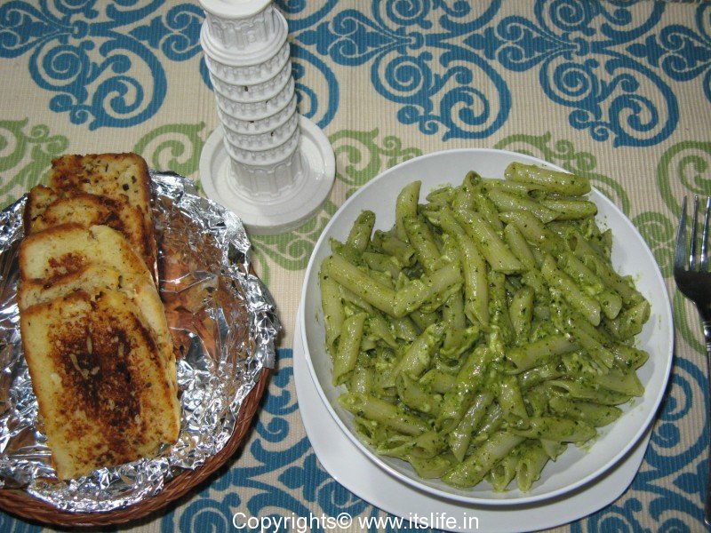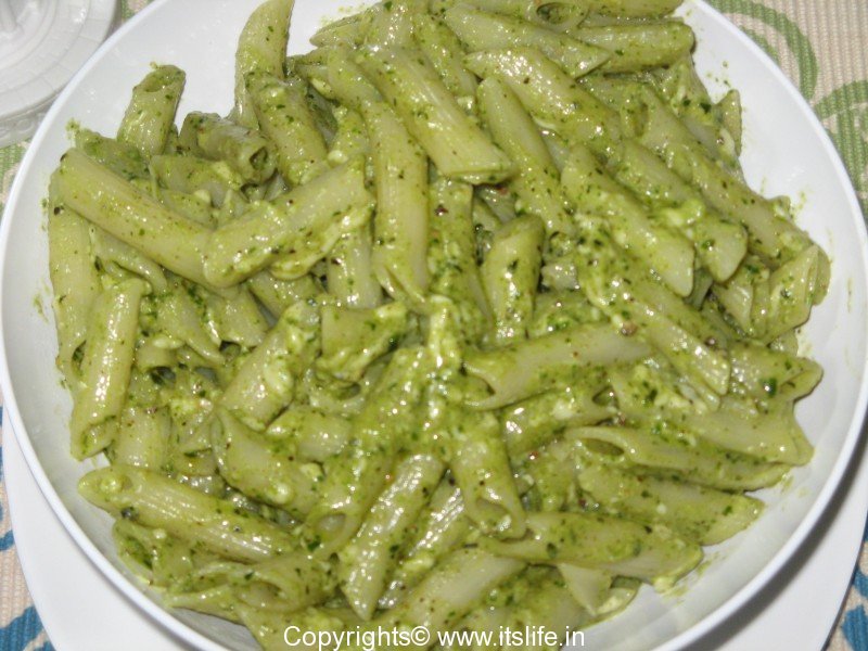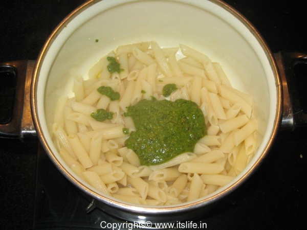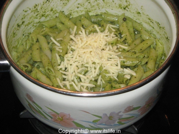 Heat a Pan and add Butter, Cooked Pasta, Pesto Sauce, and little reserved water. Toss gently. Remove the pan from heat and add Cheese and more water if needed.