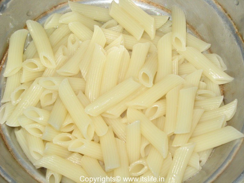Cook Pasta in boiling water until tender, Drain, and rinse in cold water. Reserve a cup of water.