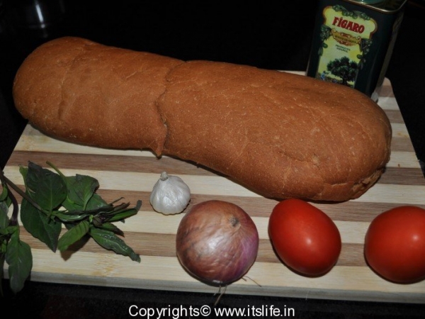 Rub the bread with the crushed Garlic. Mix Tomatoes, Onion, Mozzarella Cheese, Basil, Green Chilies, Salt in a mixing bowl.