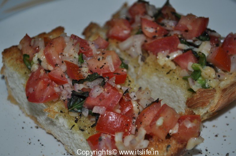 Grilled Italian breads rubbed with garlic, topped with Tomatoes, and drizzled with Olive Oil is a very popular and tasty starter.