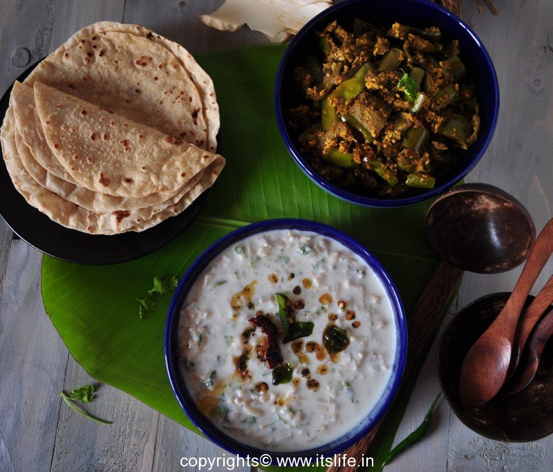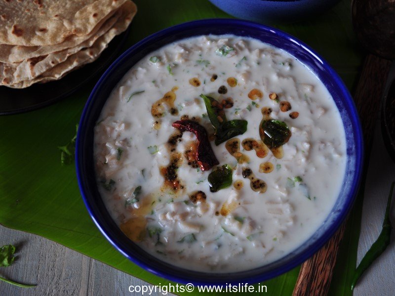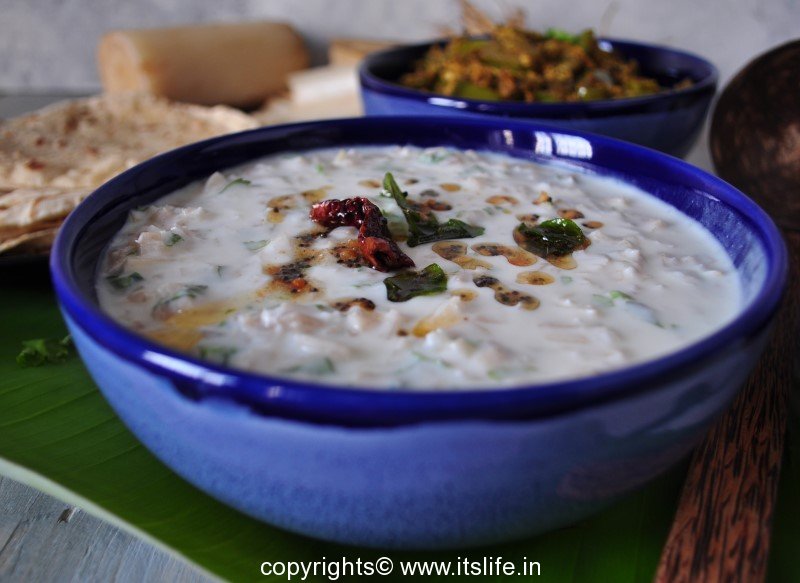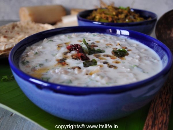 Baledindina Raitha is a cool recipe and is prepared using Banana Stem and Curds.