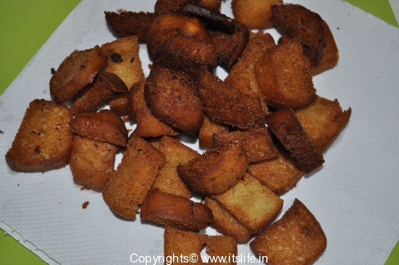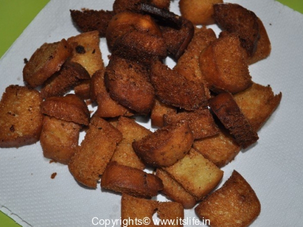 Cut Bread slices into squares. Heat Oil and deep fry until golden brown. You can toast the bread slices to make a healthier version.