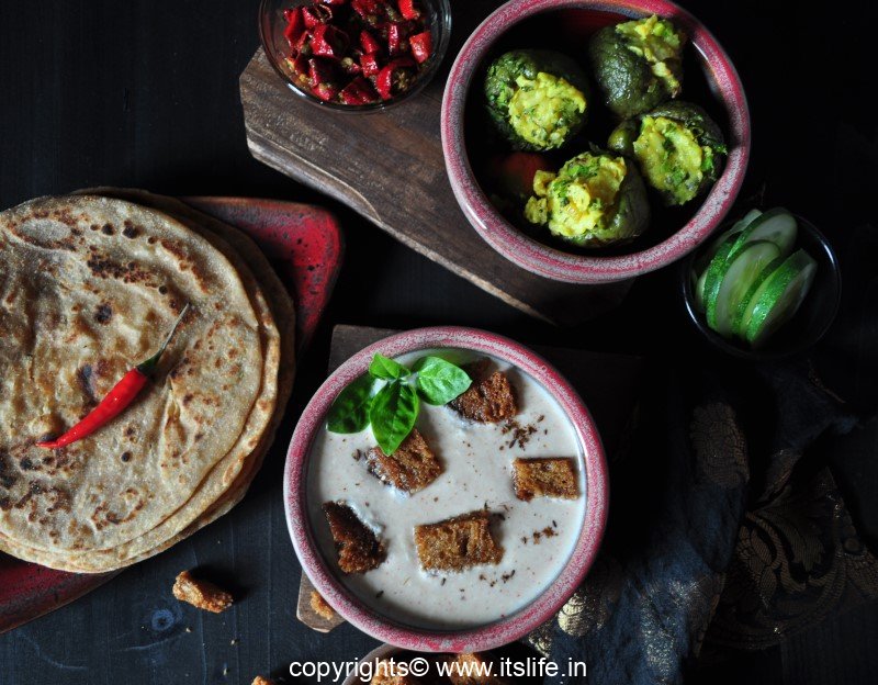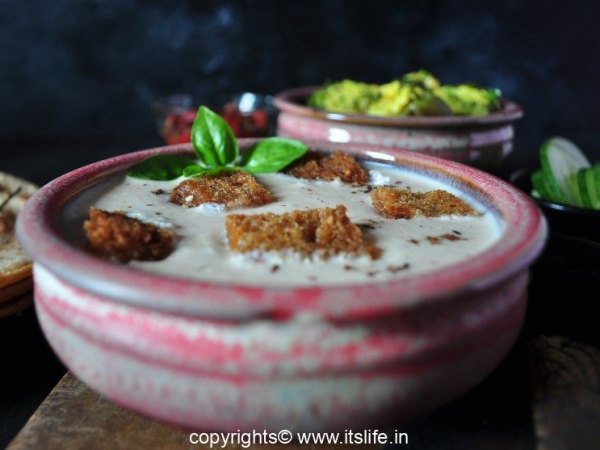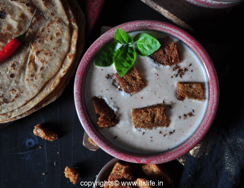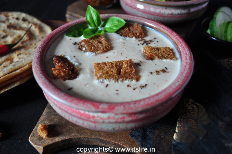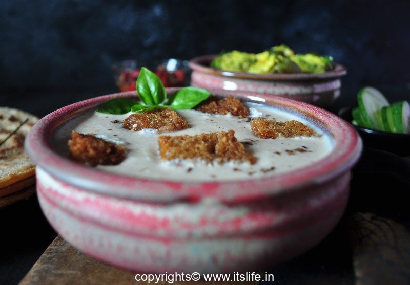 Just before serving add the deep fried crispy Bread pieces to the curd.