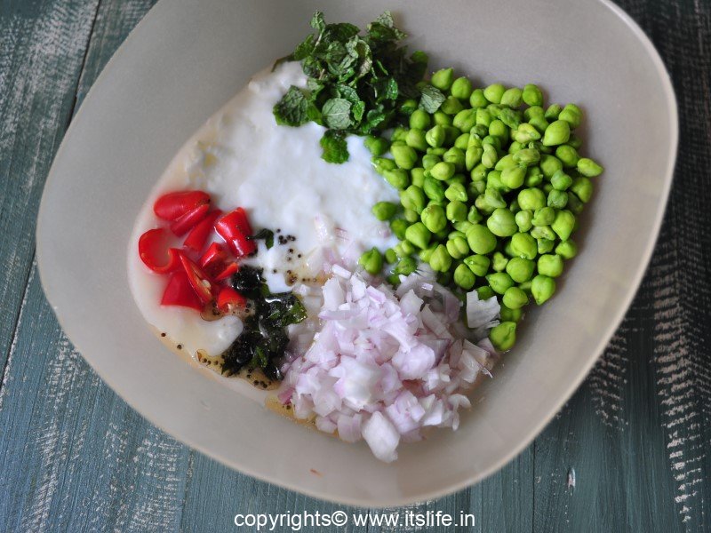 Combine Chikpea, Curds, Chilies, Mint leaves, Onion, and Salt in a bowl.