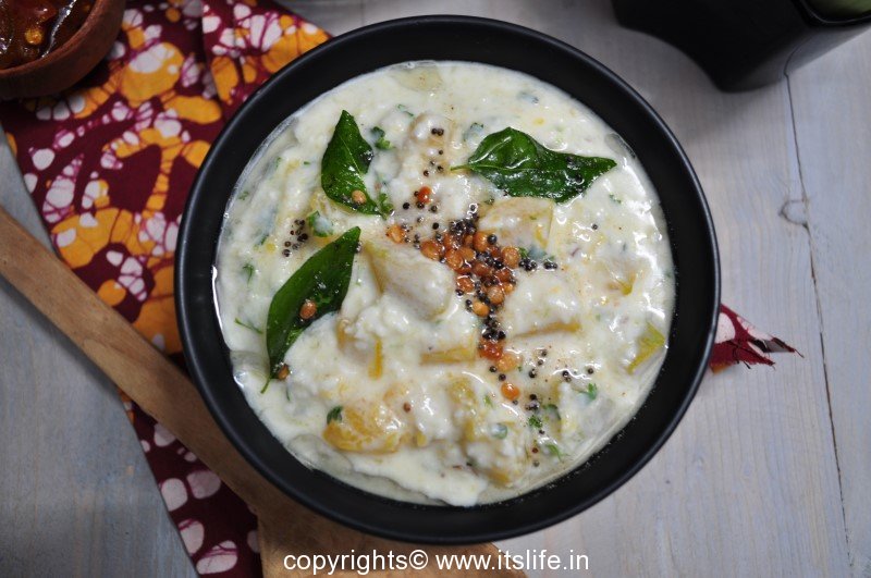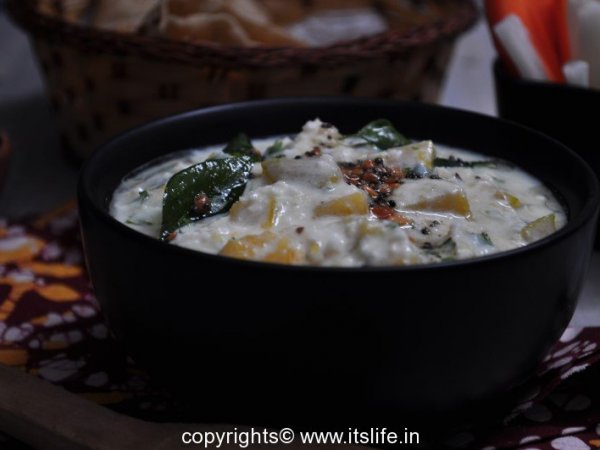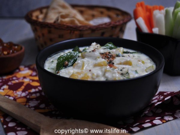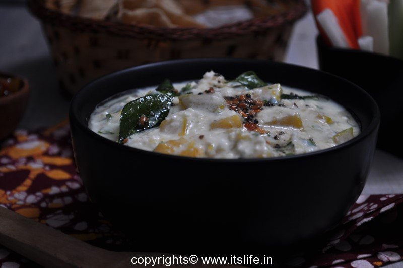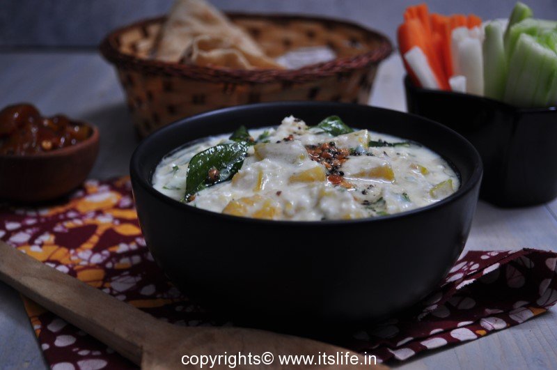 Kumbalakayi Raitha or Sweet Pumpkin Raitha is a favorite in our house. The sweet vegetable when mixed with the Yogurt sauce with a crunchy Black Gram seasoning is a dish we eat with Vegetable Bhath, Plain Rice, and Rotis.