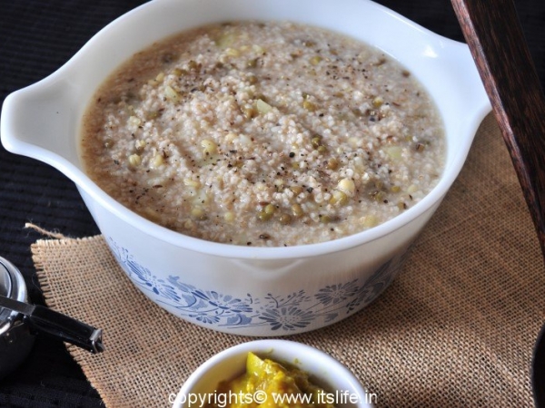 Serve hot Godi Akki Ganji with Ghee or Curds and your choice of Pickle.