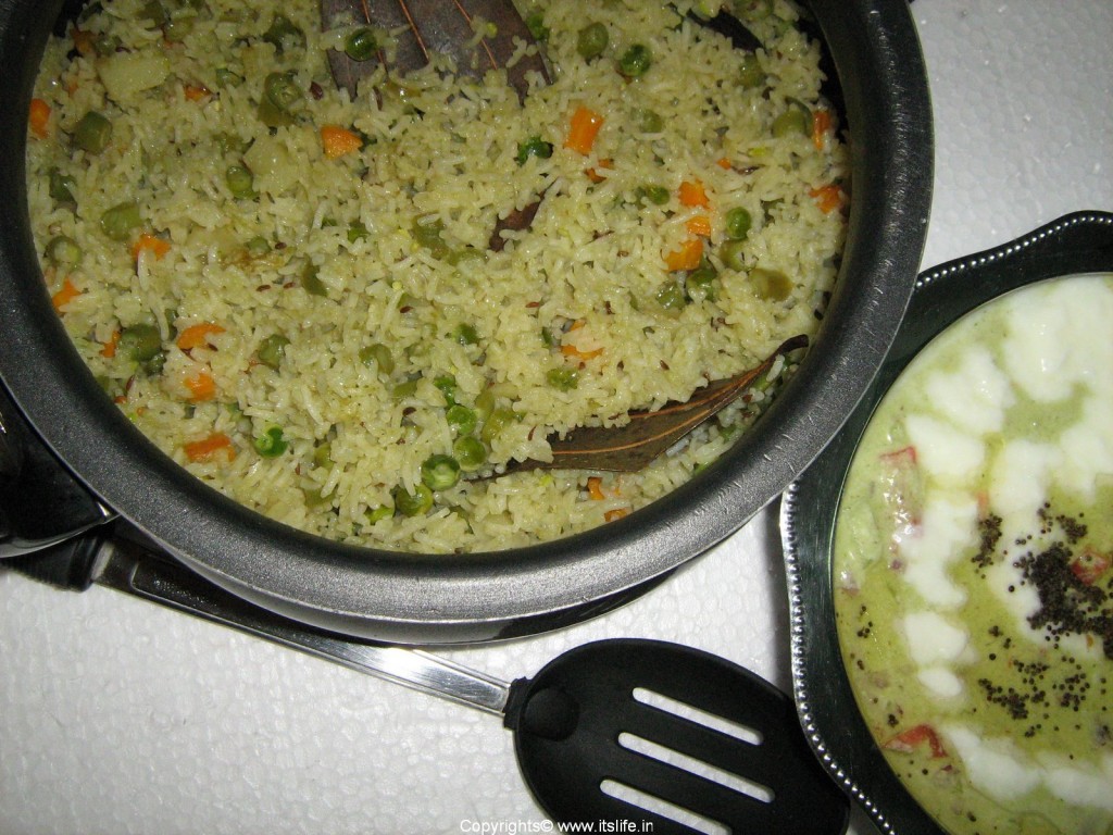 In a Handi/thick-bottomed vessel, heat Ghee and Oil and add whole garam masala one by one. Stir. Add the masala paste and stir-fry until the moisture evaporates. Add vegetables and rice and stir for a minute. Add Salt and 8 cups of water and close the vessel and cook until done. Remove the lid and add Lemon juice and mix gently. Remove to a serving dish and serve hot with Raitha.
