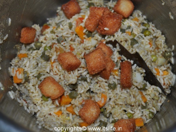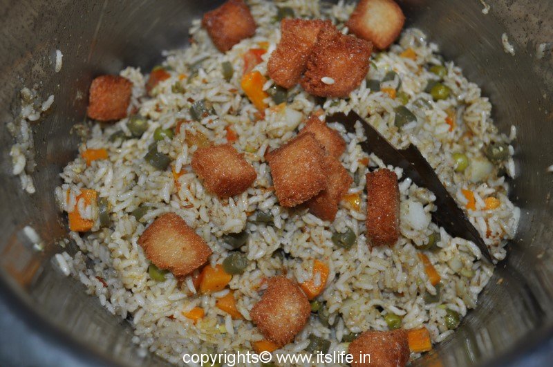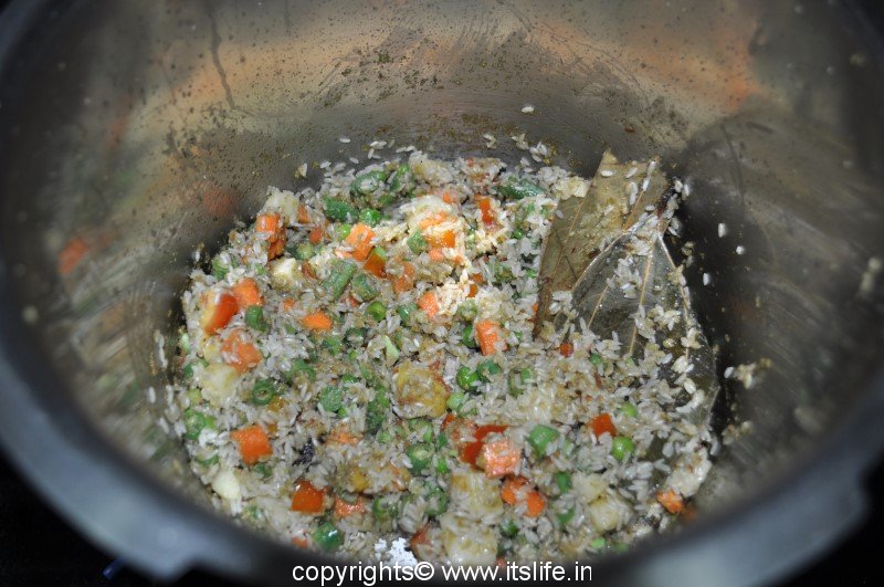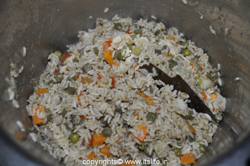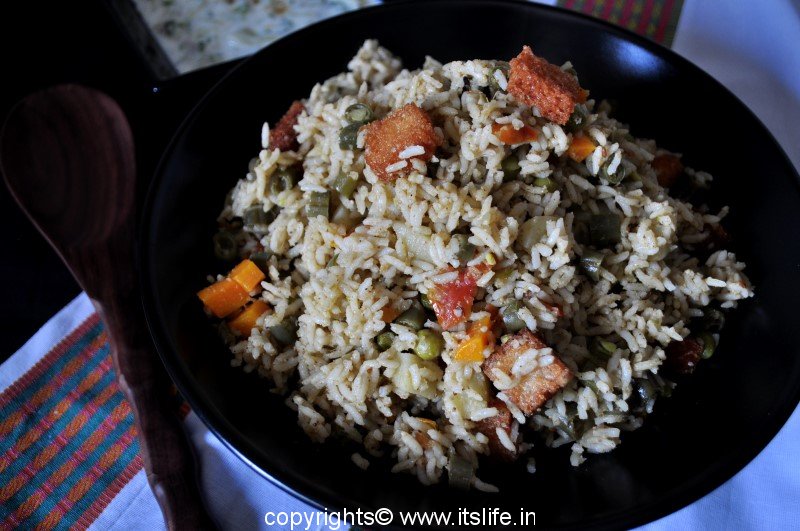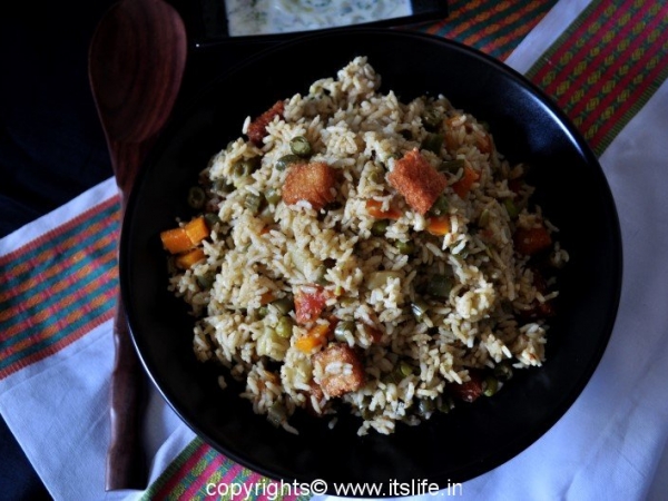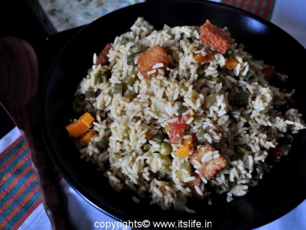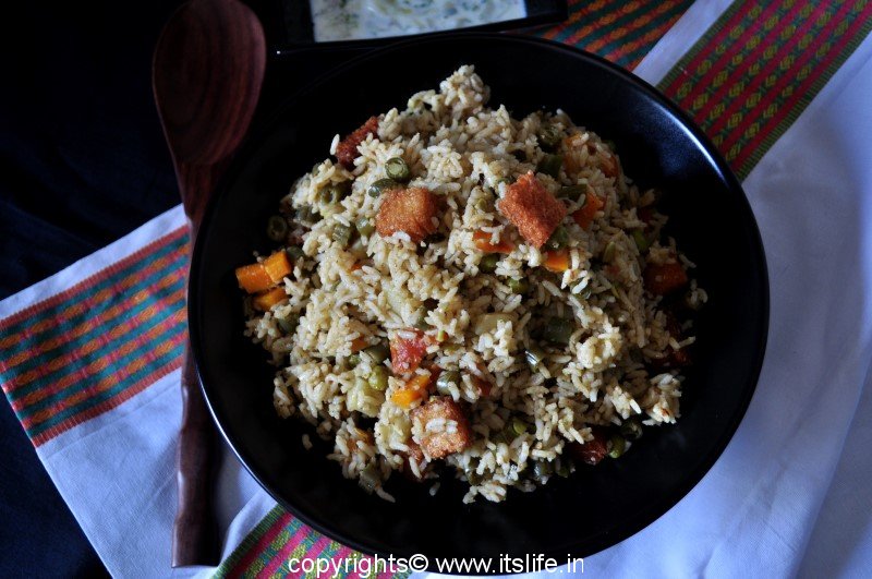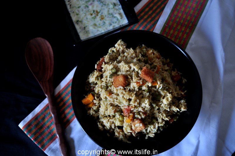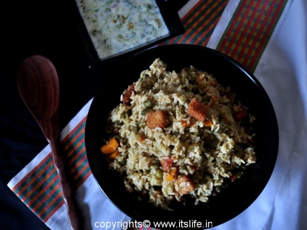 Serve South Indian Vegetable Pulao hot with Raitha.
