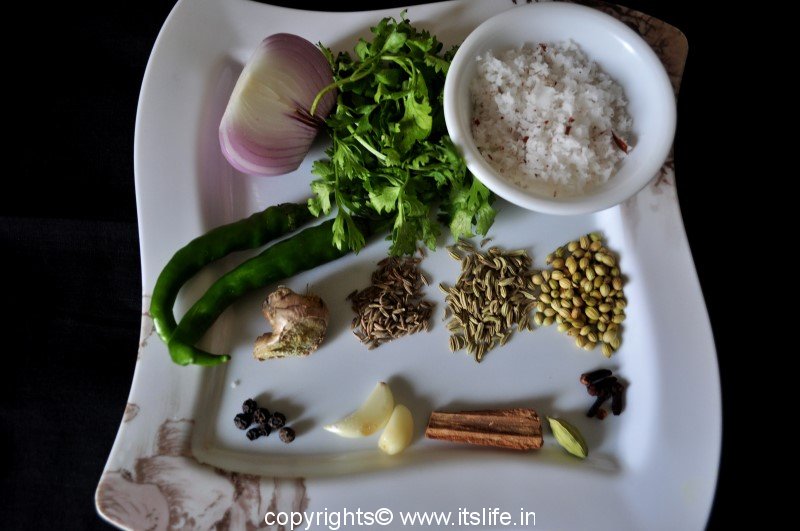 Soak rice for 30 minutes. Peel and chop Carrots and Potatoes into small pieces, string Beans and chop into small pieces. Chop Tomato. Grind the ingredients for the masala to a paste.