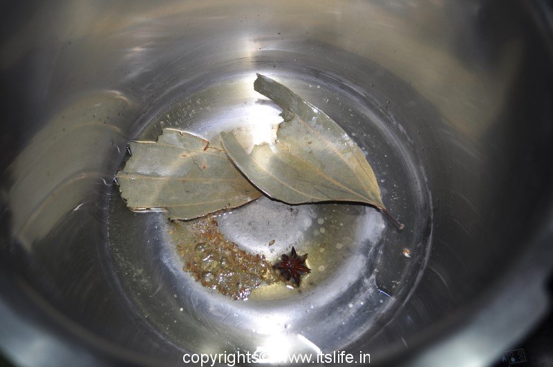 In a Handi/thick-bottomed vessel or cooker, heat Ghee and Oil and add Jeera, Star Anise, and Bay leaf. t