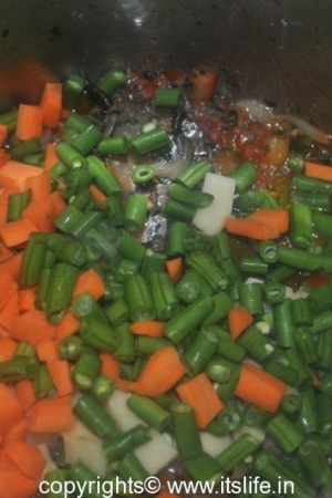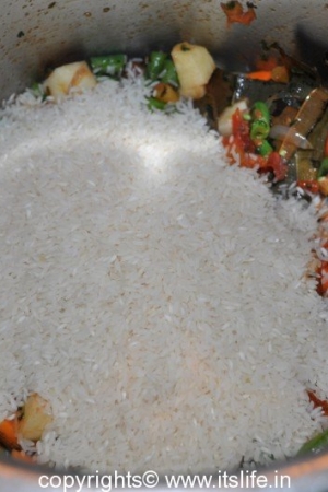 After two whistles switch off the heat. Open the cooker and gently mix. Remove to a serving dish and serve hot Vegetable Biryani with Papad and Raitha.