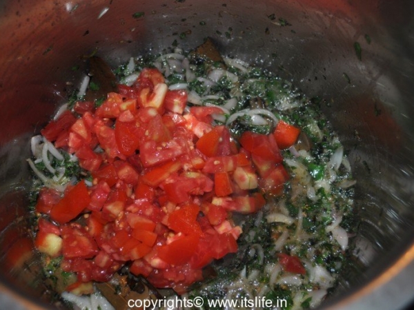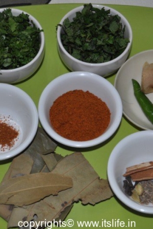 Grind Ginger, Chili, and Garlic to a paste. In a cooker heat Oil, add Bay leaves, Cardamoms, Cloves, Jeera, Ginger-Chili-Garlic paste and saute for a minute. Add Onion and stir-fry. Add Coriander and Mint leaves and stir-fry.