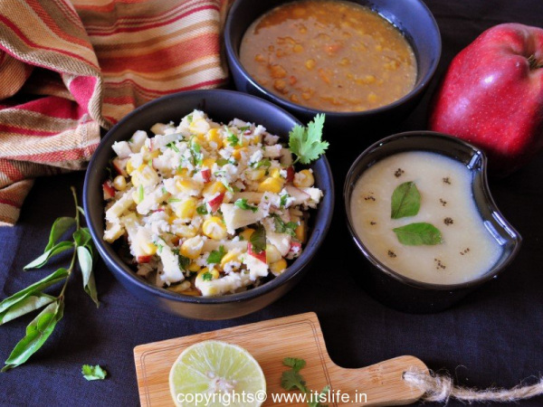 During Dasara, most of the households prepare festive food and Kosambari / salad is an integral part of the festive food. Here is a salad prepared using Apple and Corn.