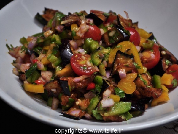 In a salad bowl mix deep fried Aubergine with the other vegetables. Pour the dressing over it. Add Lemon juice and toss gently.