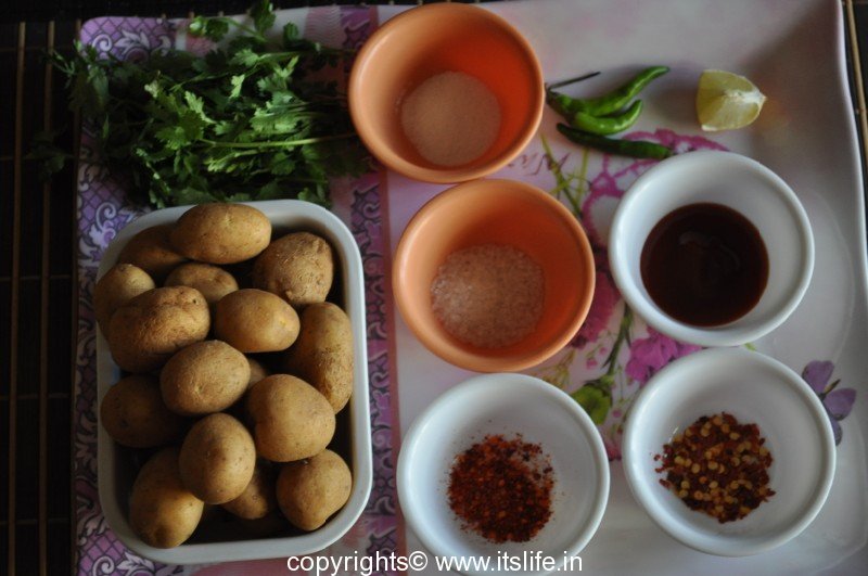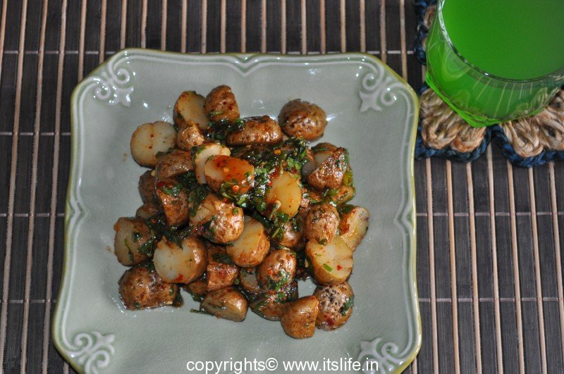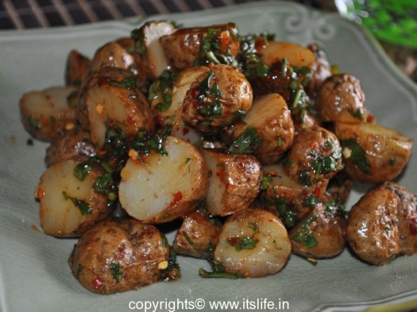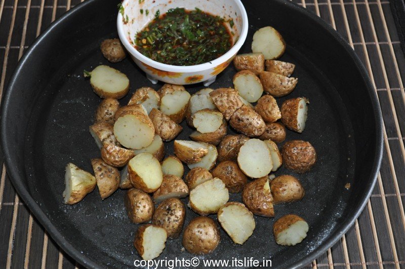 Add the Potatoes and toss. Serve Baby Potato Salad garnished with chopped Coriander leaves.