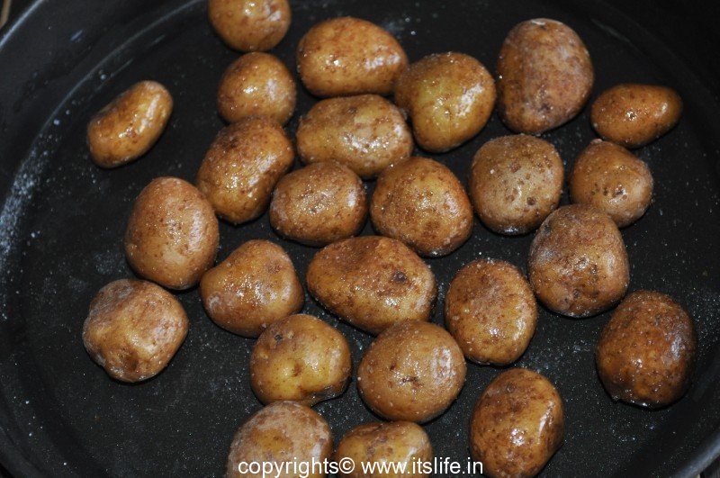 Preheat the oven. Wash the baby Potatoes and prick with a fork. Smear oil on them. Roast the Potatoes in pre-heated oven for thirty to forty minutes or till done.