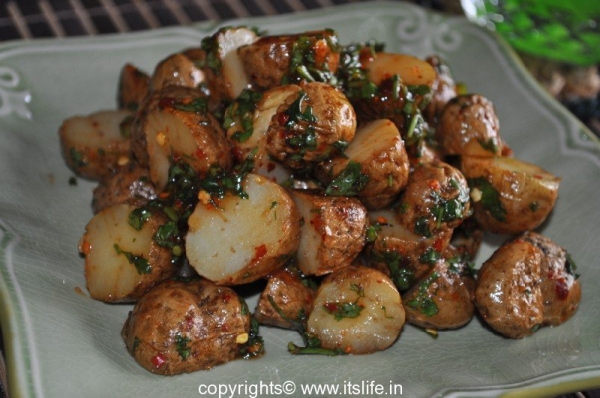 Add the Potatoes and toss. Serve Baby Potato Salad garnished with chopped Coriander leaves.