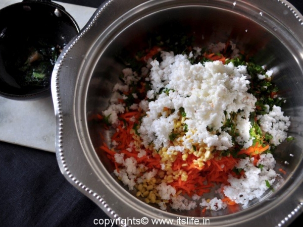 Soak Moong Dal for half an hour. Wash and peel Carrots, grate them and keep aside.